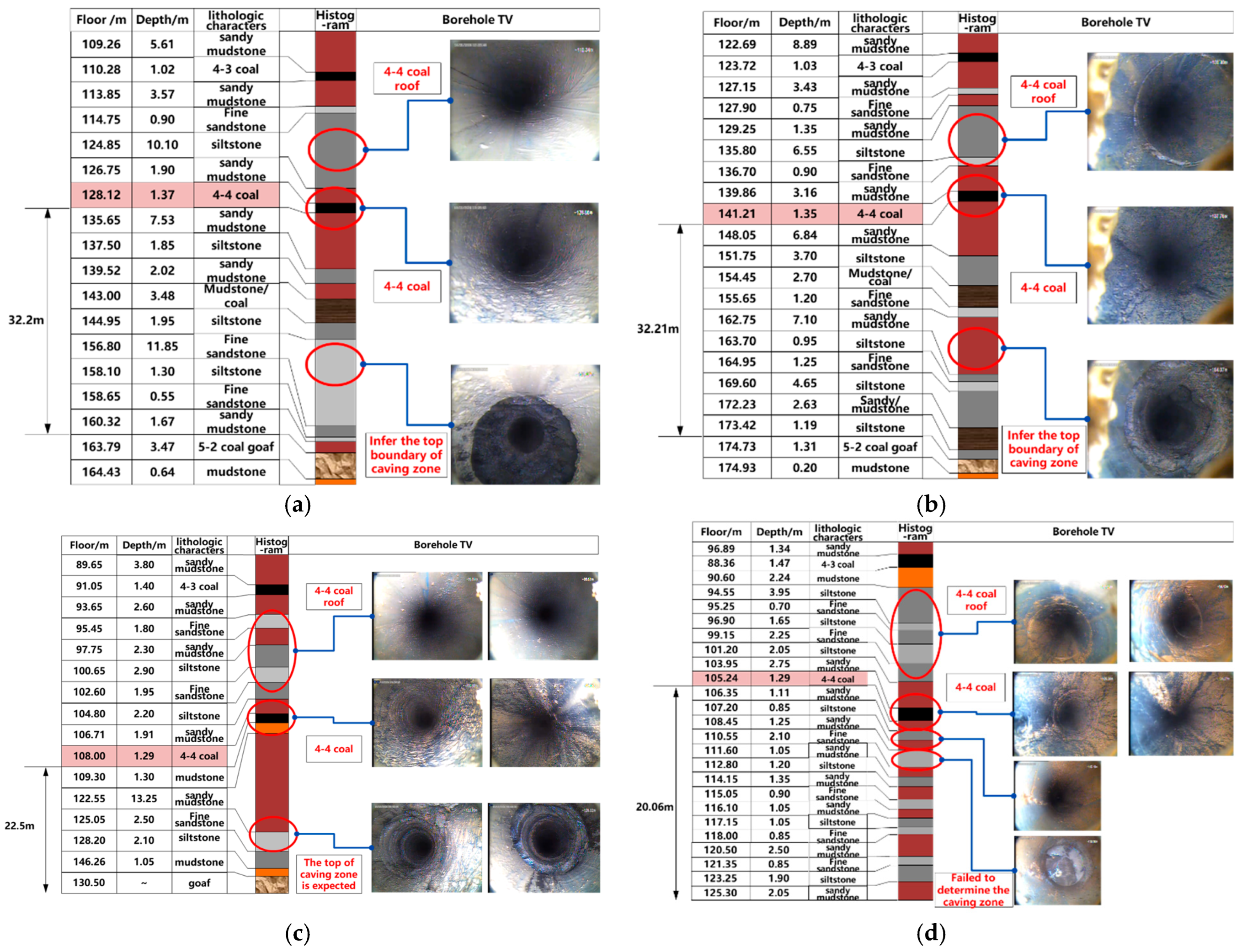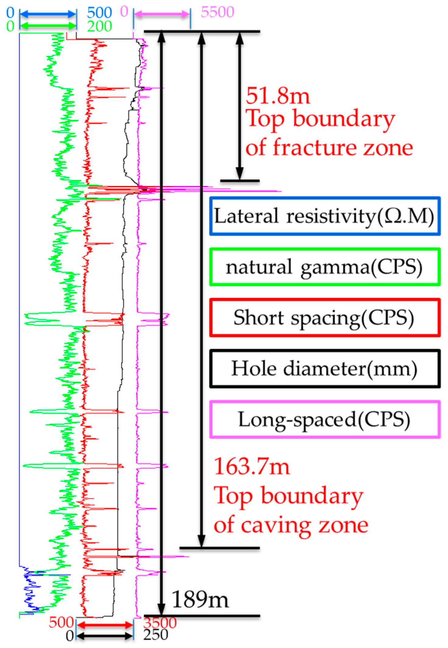 Figure 5). This phenomenon is caused by the collapse and fragmentation of the borehole wall, developed fractures, an increase in borehole diameter, and an expanded cross-sectional area—all of which lead to higher values of long and short source distances. It can be concluded that the top boundary of the fracture zone of this borehole is at a depth of 51.80 m, and the top boundary of the caving zone is at a depth of 163.70 m. Judging from the logging curve, after the mining of the 5-2 coal seam at the location of borehole YBK3, the range of the overlying rock caving zone is 0–21.56 m, the range of the fracture zone is 21.56–121.62 m, and the 4-4 coal seam is located within the fracture zone formed after the mining of the 5-2 coal seam, 22.48 m above the caving zone.