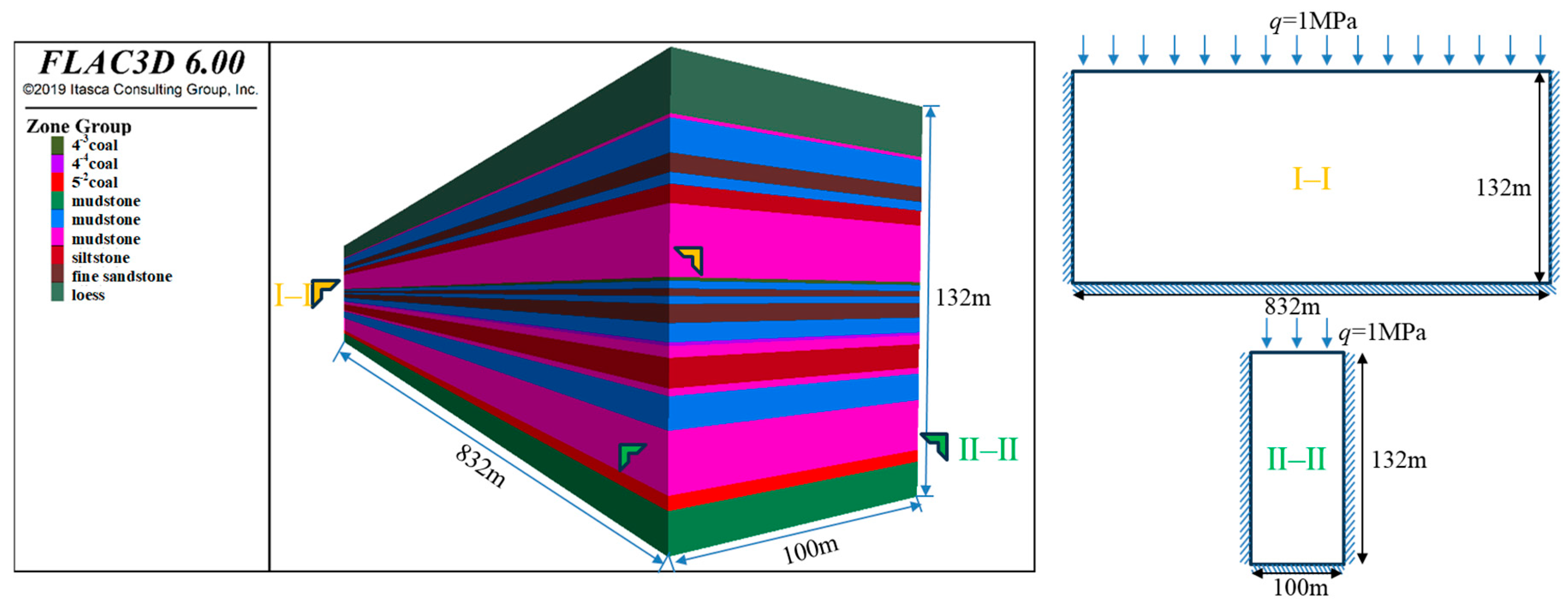 Figure 6. The model is divided into 21 layers with a size of 832 m × 100 m × 132 m (X × Y × Z). The number of division units is 10,982,400, and the number of nodes is 11,357,955. The Mohr–Coulomb model was adopted for this model. The 21 layers consist of five different rock materials. The parameter values of each rock material used in the model are shown in