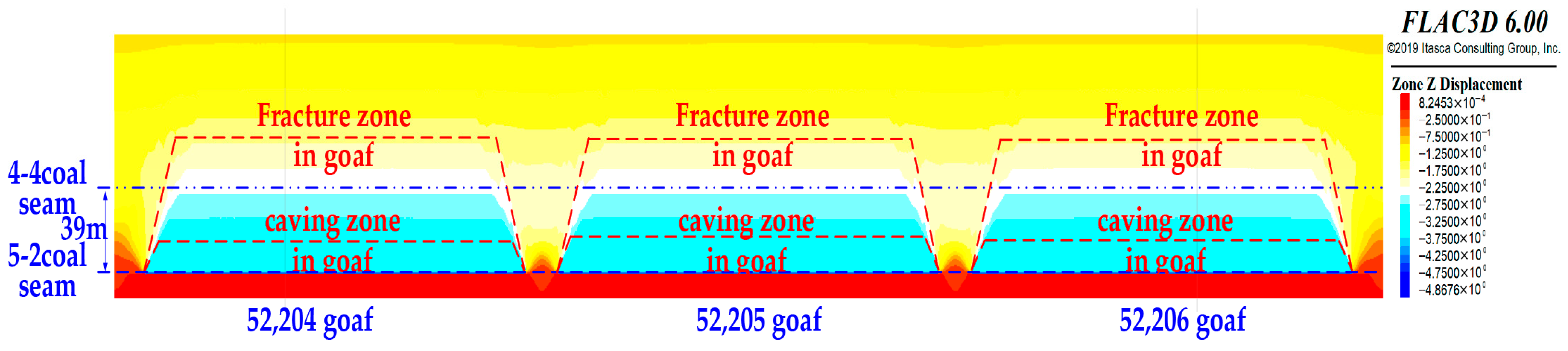 Figure 8. Taking the excavation of the 52,204, 52,205, and 52,206 working faces in the 5-2 coal seam as examples, three overlapping caving influence zones are mainly formed after the working face excavation.