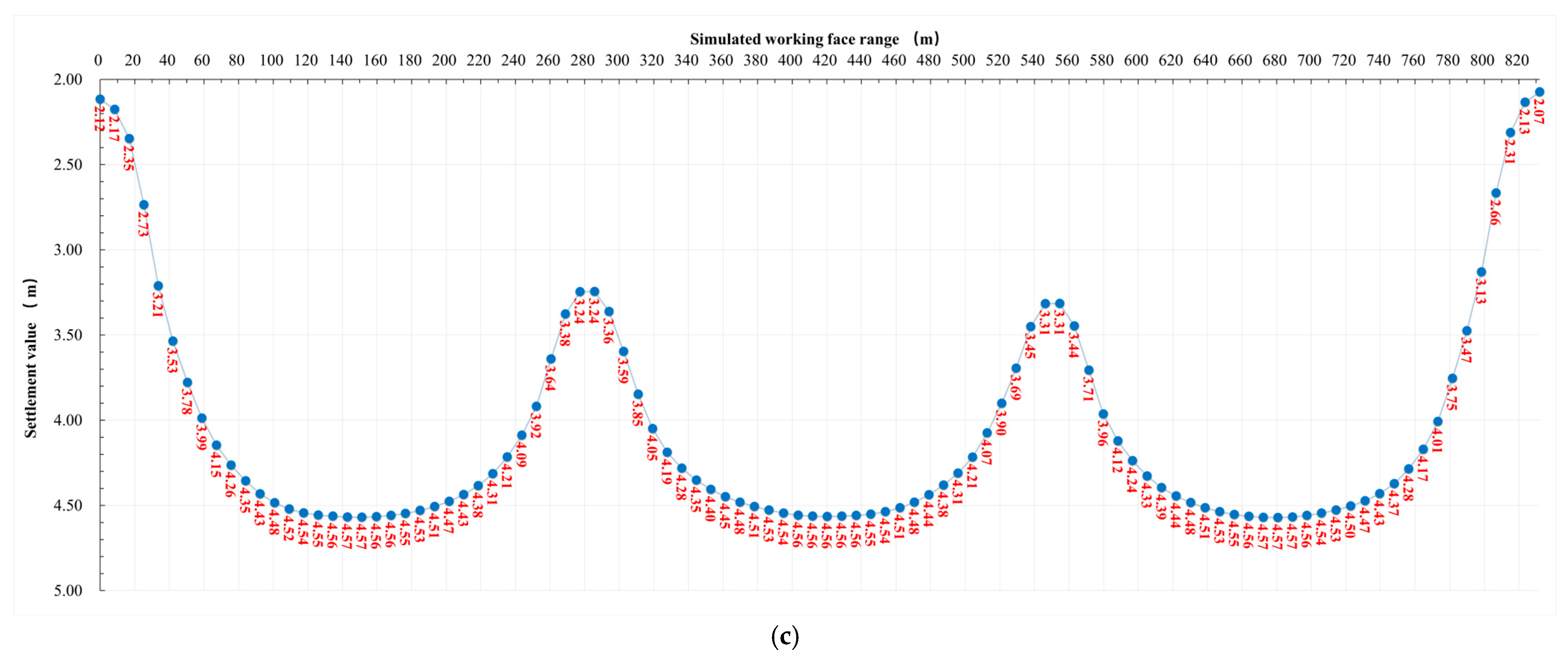 (2) For the 4-4 coal seam overlying the remaining coal pillar of the 5-2 coal seam, affected by the mining disturbance of the 5-2 coal seam goaf, the maximum subsidence amount at the center of the coal pillar (x = 292 m in