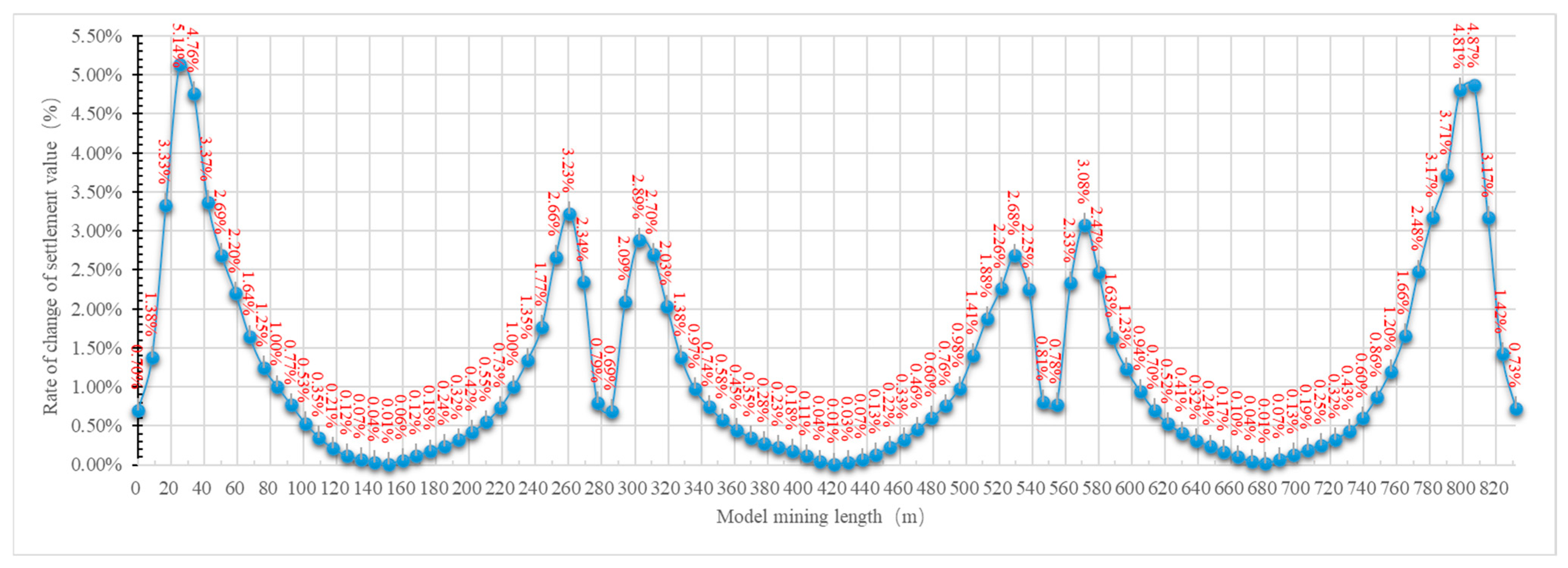 Figure 10) to quantify the settlement change rate (slope, dw/dx) across its floor after the mining of the 5-2 coal seam. This yielded the per-meter settlement curve of the 4-4 coal seam floor at each position, as shown in