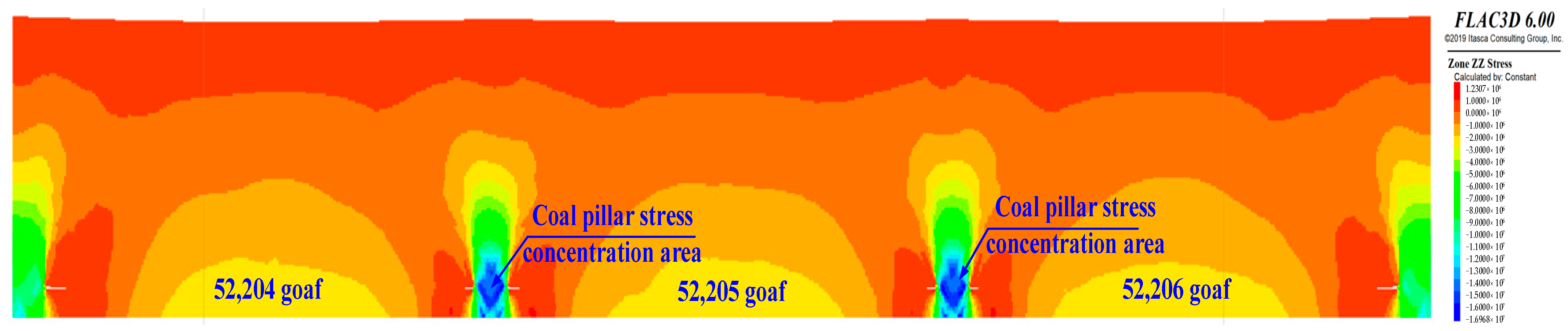 (4) By counting the stress concentration degree at the floor of the 4-4 coal seam overlying the remaining coal pillar and goaf of the 5-2 coal seam, although the maximum stress concentration factor at the remaining coal pillar of the 5-2 coal seam (1.24) is greater than that at the goaf (0.53), the maximum stress at the coal pillar is only 0.80 MPa higher than the in situ stress, with a small stress increase.