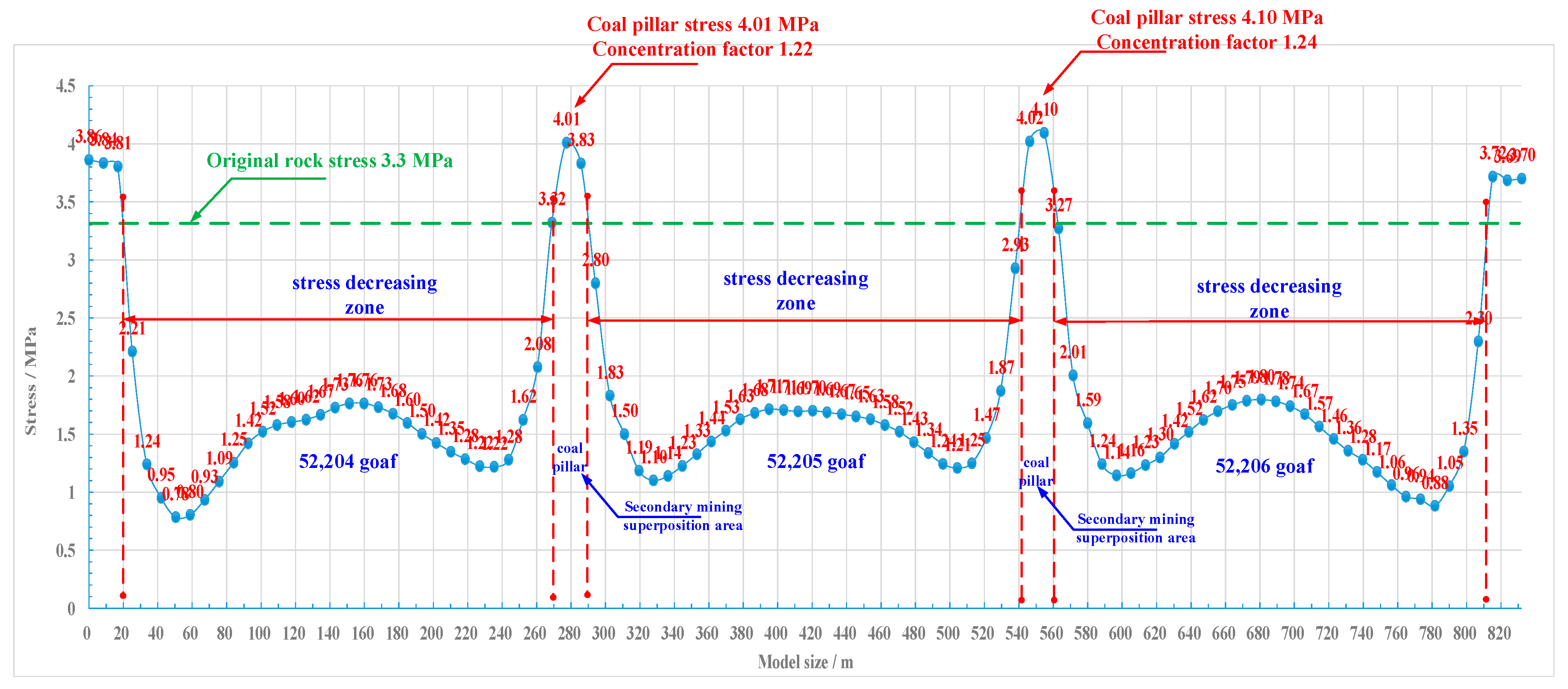 Figure 13. It can be seen from the diagram that (52,204, 52,205, 52,206), there is a significant stress concentration phenomenon in the coal pillars. The peak stress is significantly greater than after mining of the first working face (52,204). Based on the stress contour maps, the vertical stress curve of the 4-4 coal seam was plotted and is shown in