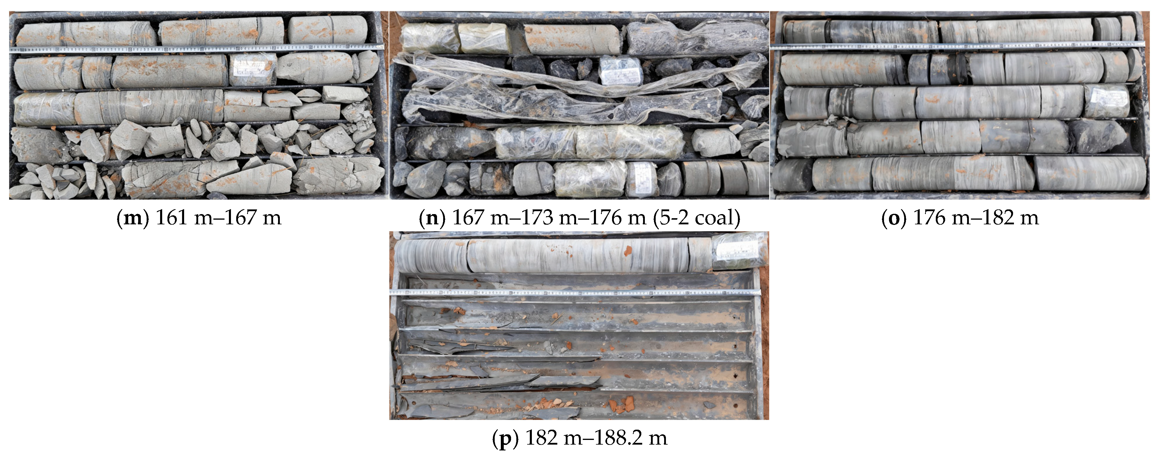 According to the statistical results of previous boreholes in Yujialiang Coal Mine, the average interval between the 4-4 coal seam and the 5-2 coal seam is 39.45 m. To expose the location of the caving zone and ensure adequate penetration into the fractured rock mass for accurate identification of the “two zones”, the design principle for the final hole horizon is as follows: the final hole horizon of boreholes YBK5 and YBK6 is 20 m below the floor of the 4-4 coal seam to ensure that the borehole traverses the potential caving zone developed below the 4-4 seam. The final hole horizon of the other boreholes (YBK1, YBK2, YBK3, YBK4) is 10 m below the floor of the 5-2 coal seam, which is sufficient to assess the immediate overburden failure characteristics above the mined-out seam and the condition of the interburden rock. The borehole result parameters are shown in