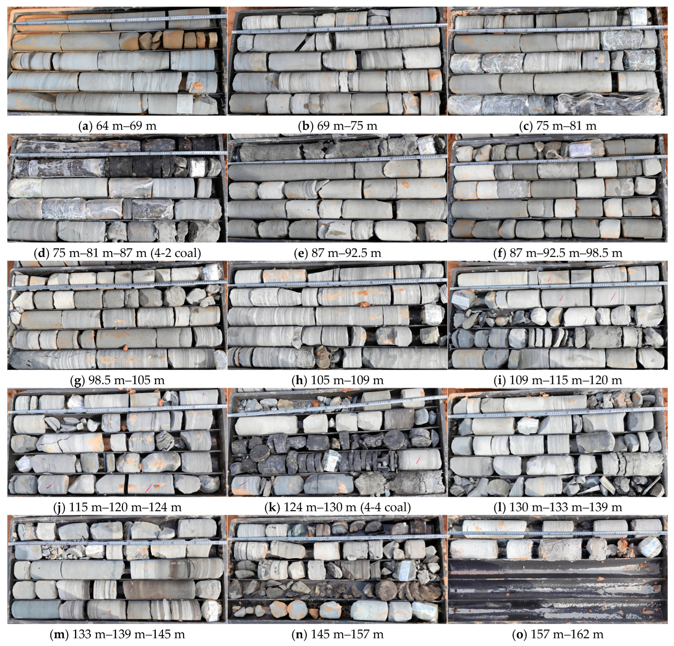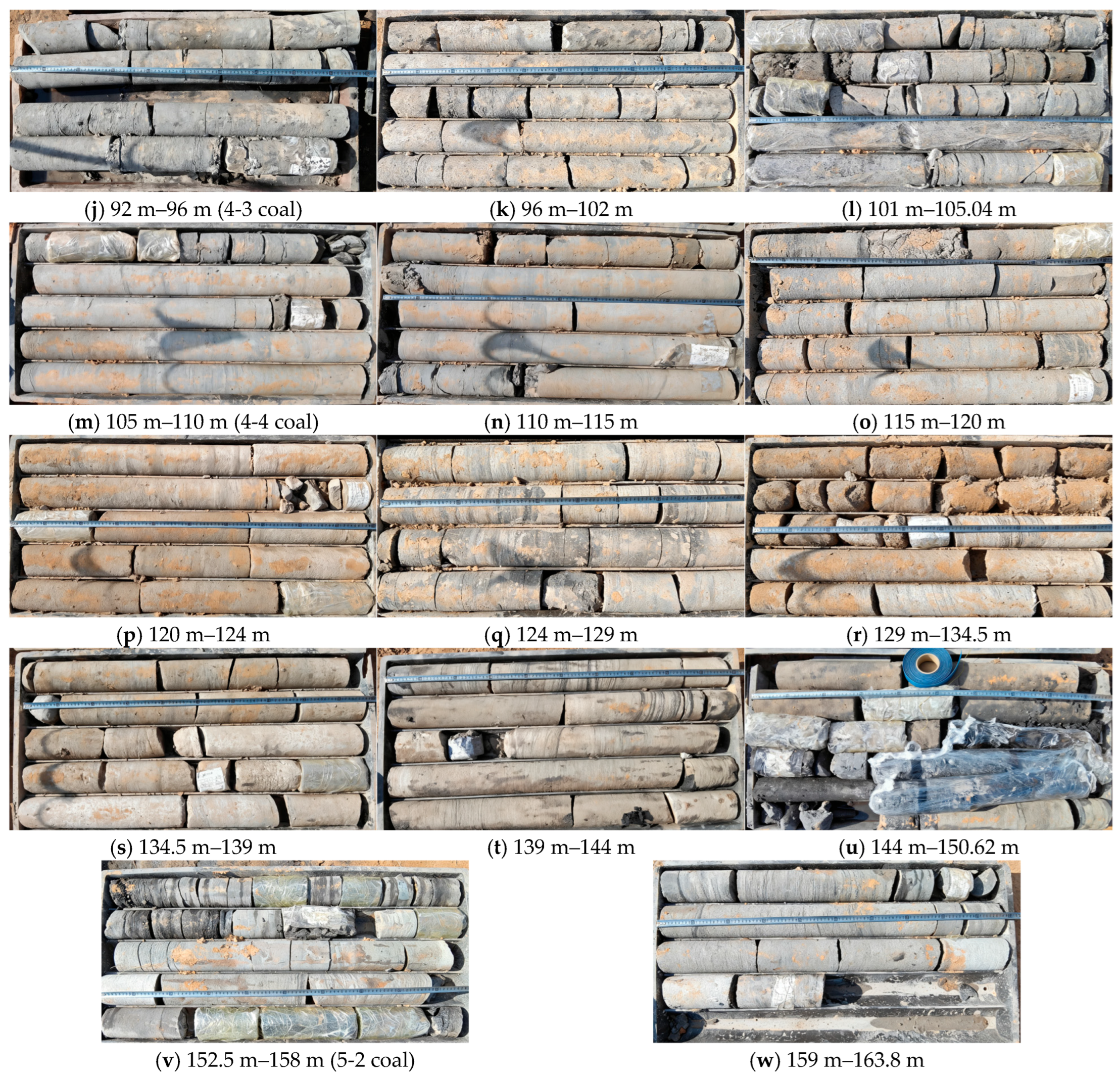 (1) Analysis by horizontal position ranks core integrity (descending order) as follows: 5-2 coal pillar (fair–excellent) > 15 m from pillar edge (fair–poor) > goaf center (poor–very poor).