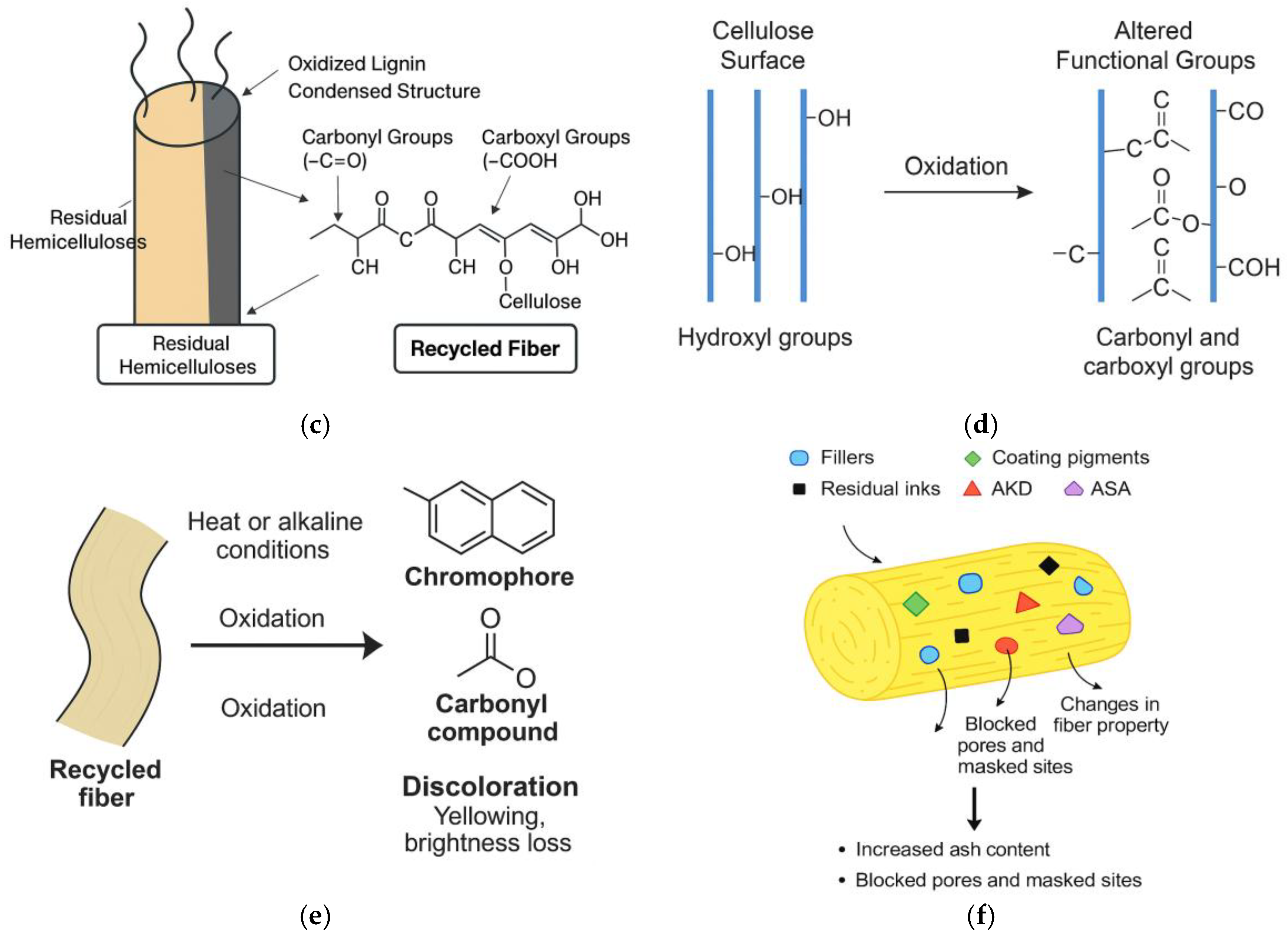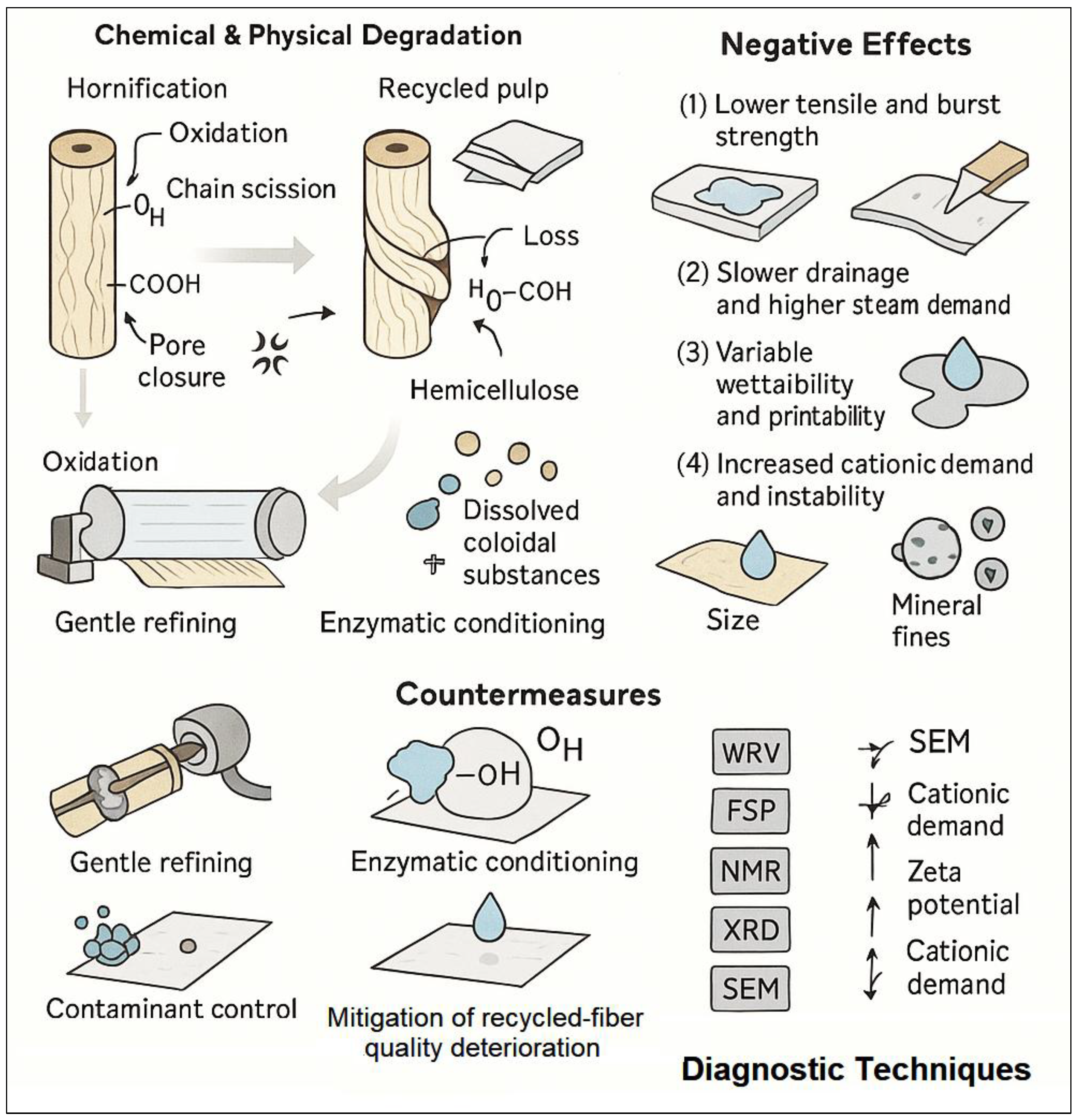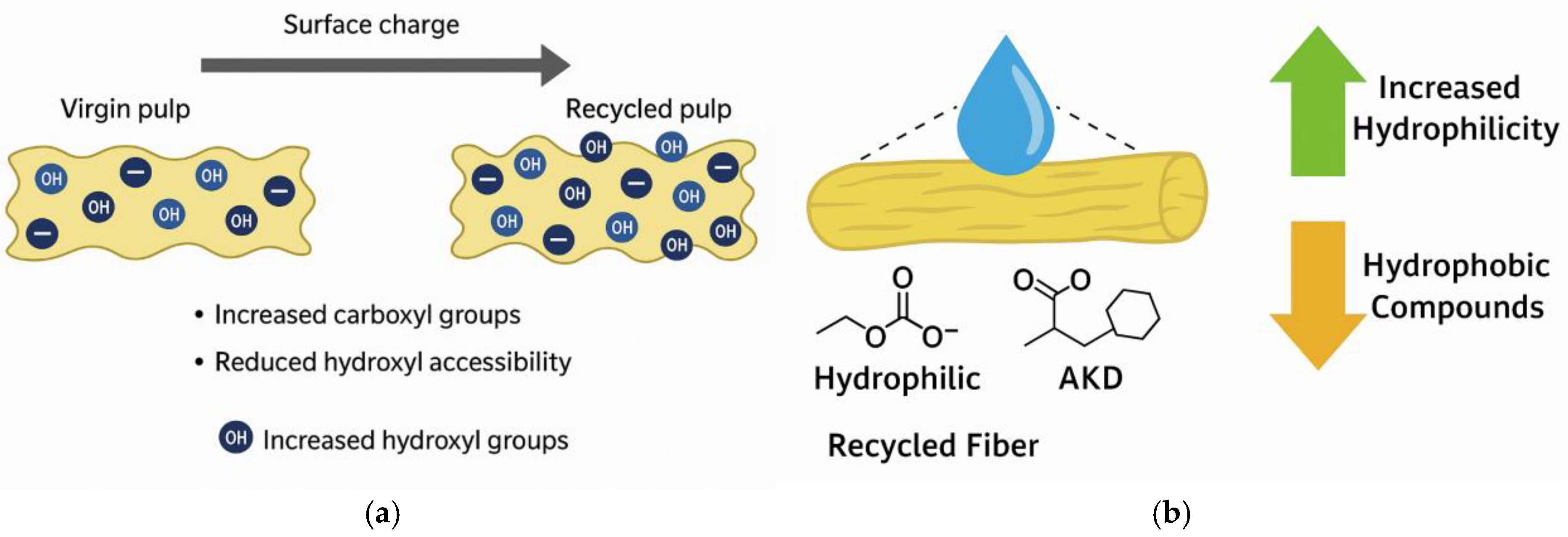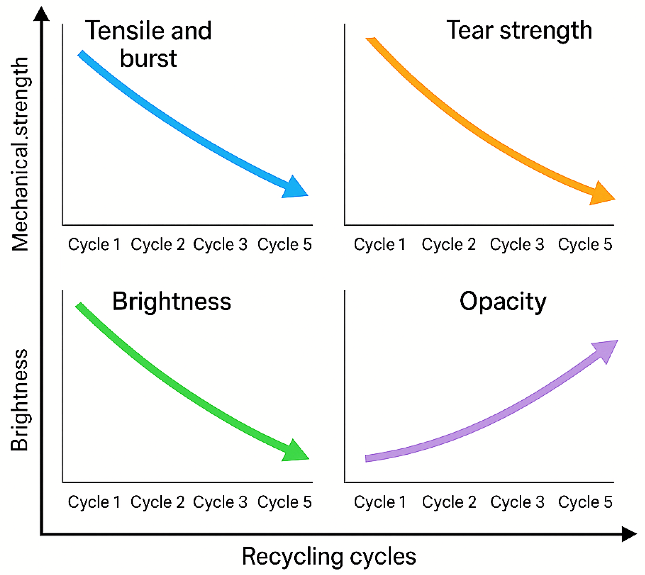 | Fiber length | Progressive shortening due to mechanical cutting during pulping and refining. | Reduced fiber–fiber contact area; lower bonding potential. | Decreased tensile and tear strength; need for virgin fiber blending. |