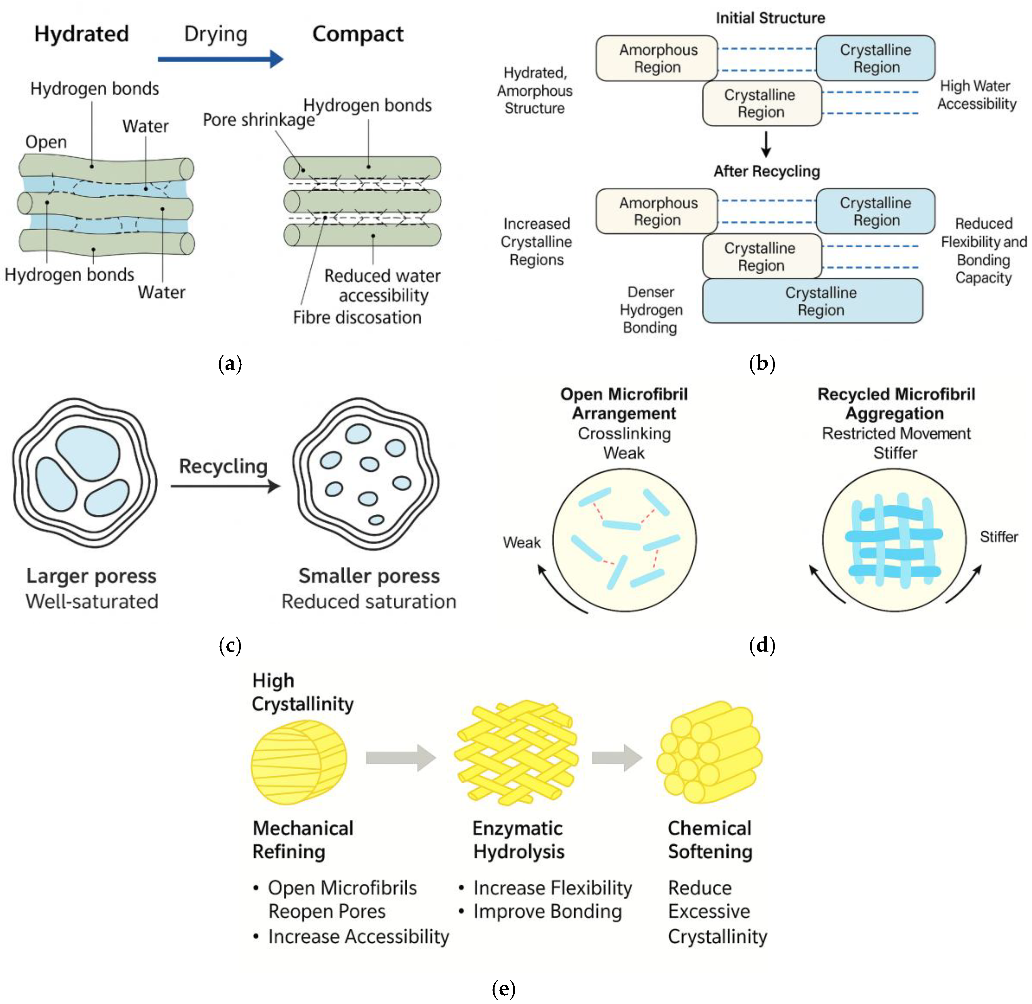 | Crystallinity | Increase in crystalline regions due to drying and hornification. | Higher stiffness, lower water absorption. | Reduced flexibility and bonding potential. |