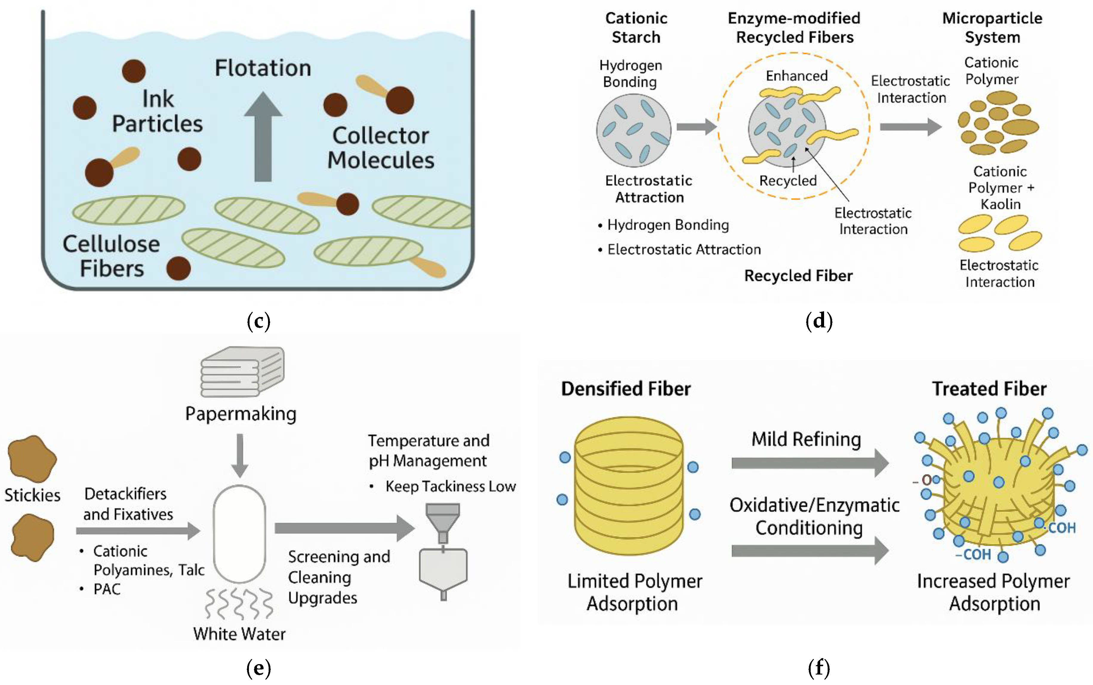 | Coating binders and latex residues | SBR, PVA, Acrylic copolymers | Modify zeta potential and drainage; contribute to hydrophobic surface areas and non-uniform sizing response; generate oligomers during degradation. | Use enzymatic pre-treatment to hydrolyze residues; adjust retention programs to manage increased hydrophobicity; enhance washing stages. |