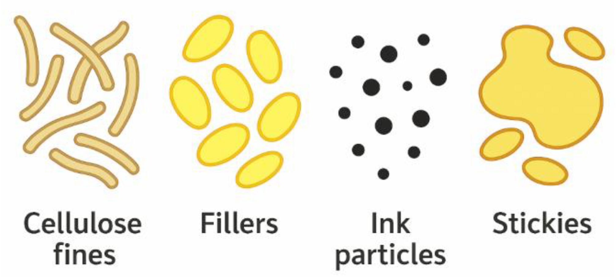 | Dissolved and colloidal substances (DCSs) | Degraded hemicelluloses, dispersants, surfactants, extractives, latex residues | Increase anionic charge, compete with cationic polymers, destabilize flocs; adsorb on fines and fibers, leading to stickies and deposit formation. | Employ fixatives (polyamines, PAC, alum); use DAF and washing to reduce DCSs; maintain balanced white-water chemistry. |