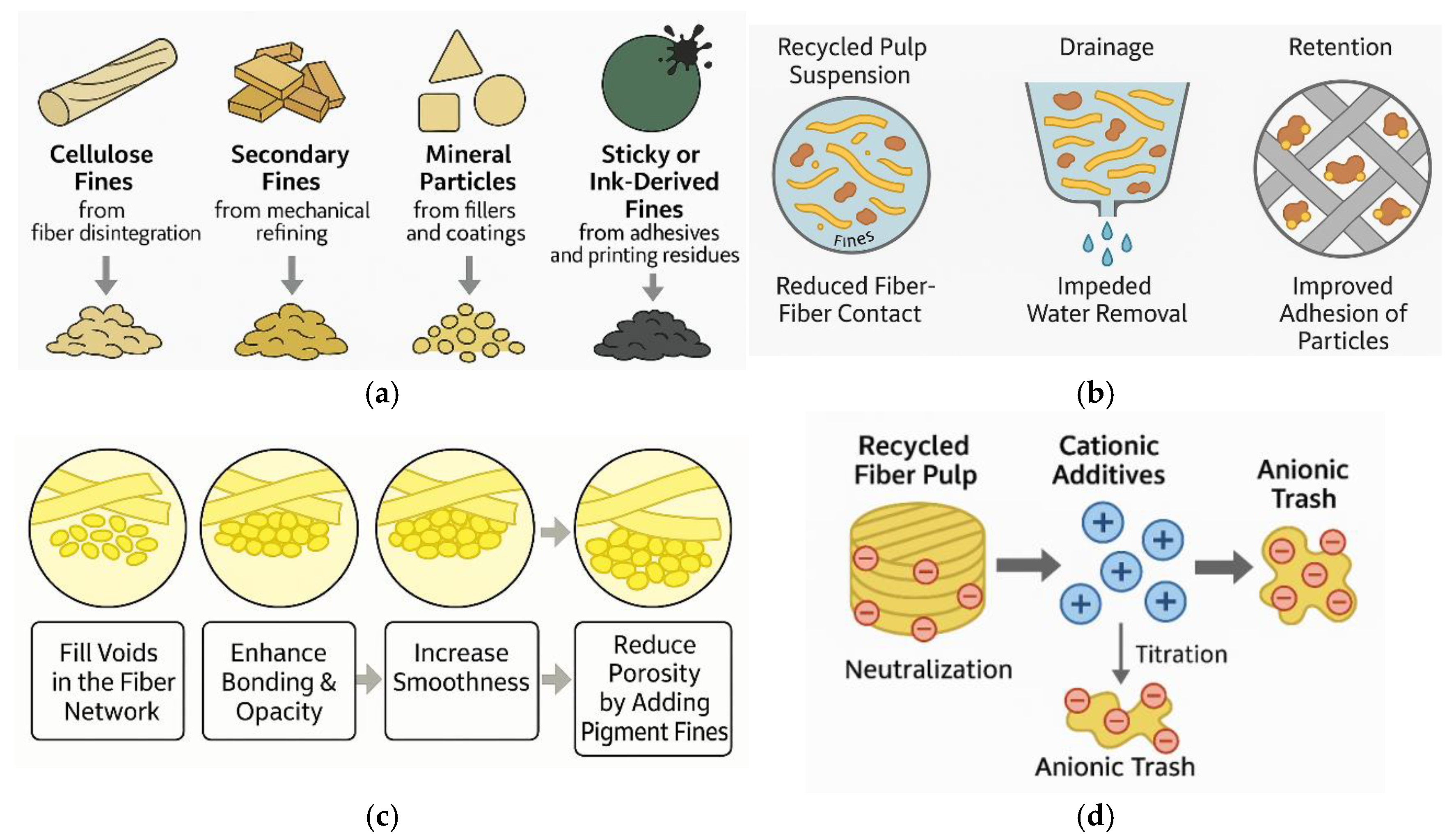 | Fines and ash accumulation | Retention of inorganic fillers and fines in recycled pulp. | Altered fiber chemistry and zeta potential. | Affects drainage, strength, and optical properties. |