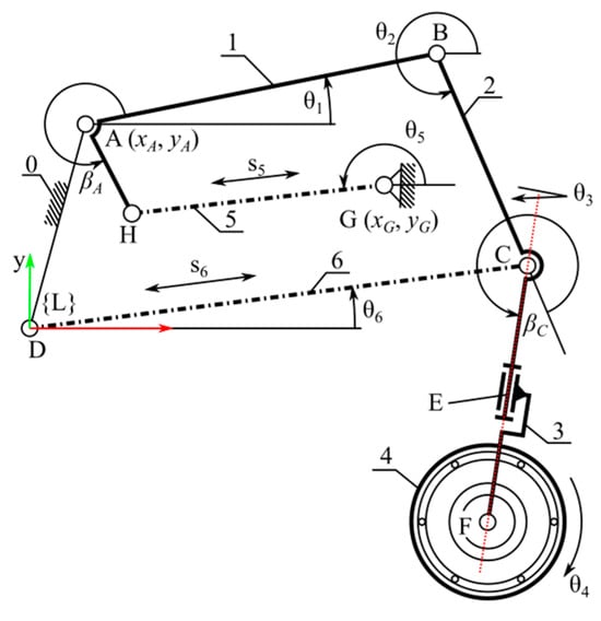 A wide range of strategies used in dimensional synthesis have already been explored [18,19,20]. The developed dimensional synthesis method focuses on determining the common dimensions of the limb to perform the intended walking and riding movements, i.e., the appropriate guidance of the centre of the wheel—point F. Two tasks of the wheel suspension mechanism have been identified: