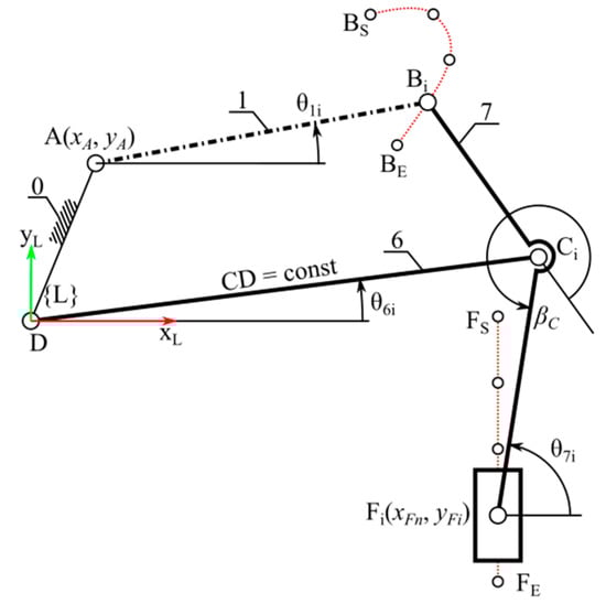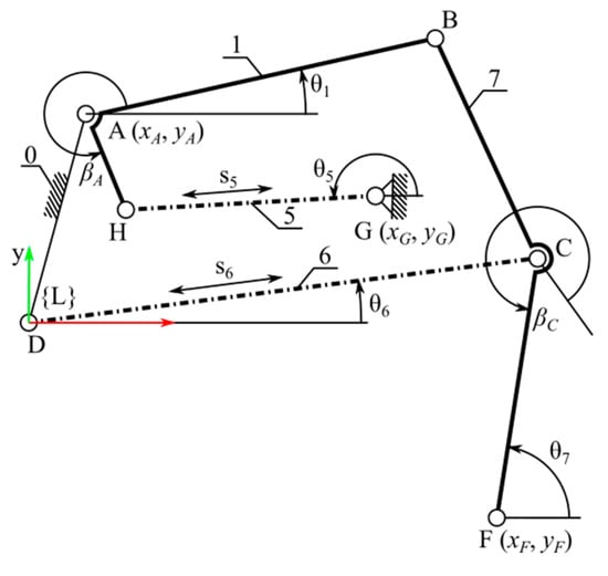 It was assumed that the axes of the wheel steering drive θ3 and the driving drive θ4 intersect at point F. It was also determined that the steering axis θ3 is aligned along the CF segment (Figure 1 and Figure 2). As a result of this assumption, the movements of these drives do not affect the displacement of the wheel centre F relative to the limb coordinate system {L}. Therefore, in the subsequent stages of synthesis, the θ3 and θ4 drives were omitted, as they do not affect the movement of the wheel centre. After replacing members 2, 3 and 4 with a single replacement link 7 (Figure 1 and Figure 2), a two-degree-of-freedom (2 DoF) planar mechanism was obtained (Figure 2).