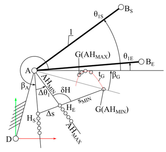 For the specified length AH and angle βA, the starting point HS was obtained, corresponding to the position of member 1 in the initial orientation θ1S. The endpoint HE corresponds to the position of member 1 determined by the specified angle θ1E. At point HS, actuator s5 should be in its minimum stroke position sMIN, while at point HE, it should be in its maximum stroke position sMAX. The intersection of circles O5 (with centre at HS and radius sMIN) and O6 (with centre at HE and radius sMAX) determines the position of point G. The minimum length of lever AHMIN is that at which circles O5 and O6 are tangent to each other. Point G is then located on a straight line passing through points HS and HE, at a distance sMIN from point HS. The length AHMIN was determined based on the isosceles triangle HSAHE, where the base of the triangle HSHE has a stroke length s5 equal to Δs = sMAX − sMIN: