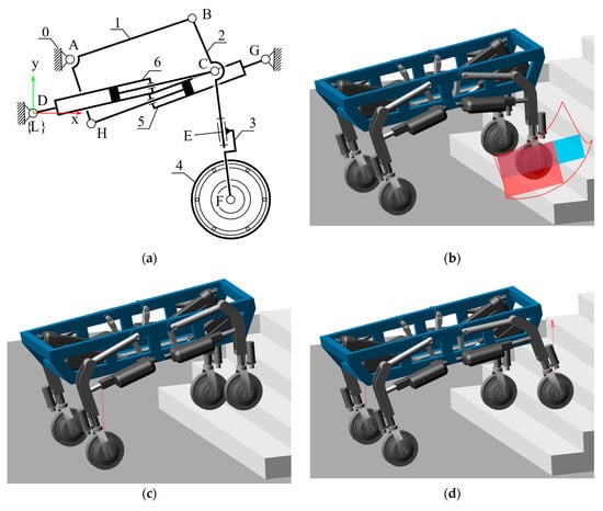 (a) A kinematic scheme of the new limb mechanism with dimensions (Table 3, row 10) obtained based on the developed synthesis procedure, (b) model of wheel–legged mobile robot designed based on the obtained limb mechanism, (c) wheel lifting motion over the step, and (d) wheel extension motion over the step while overcoming the stairs.