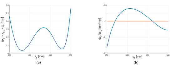 (a) The deviation of point F from the assumed straight trajectory used to level the robot platform, and (b) the derivative of vertical position yF depending on actuator extension s5 (blue), and it desired constant value (red) defined by Equation (4).