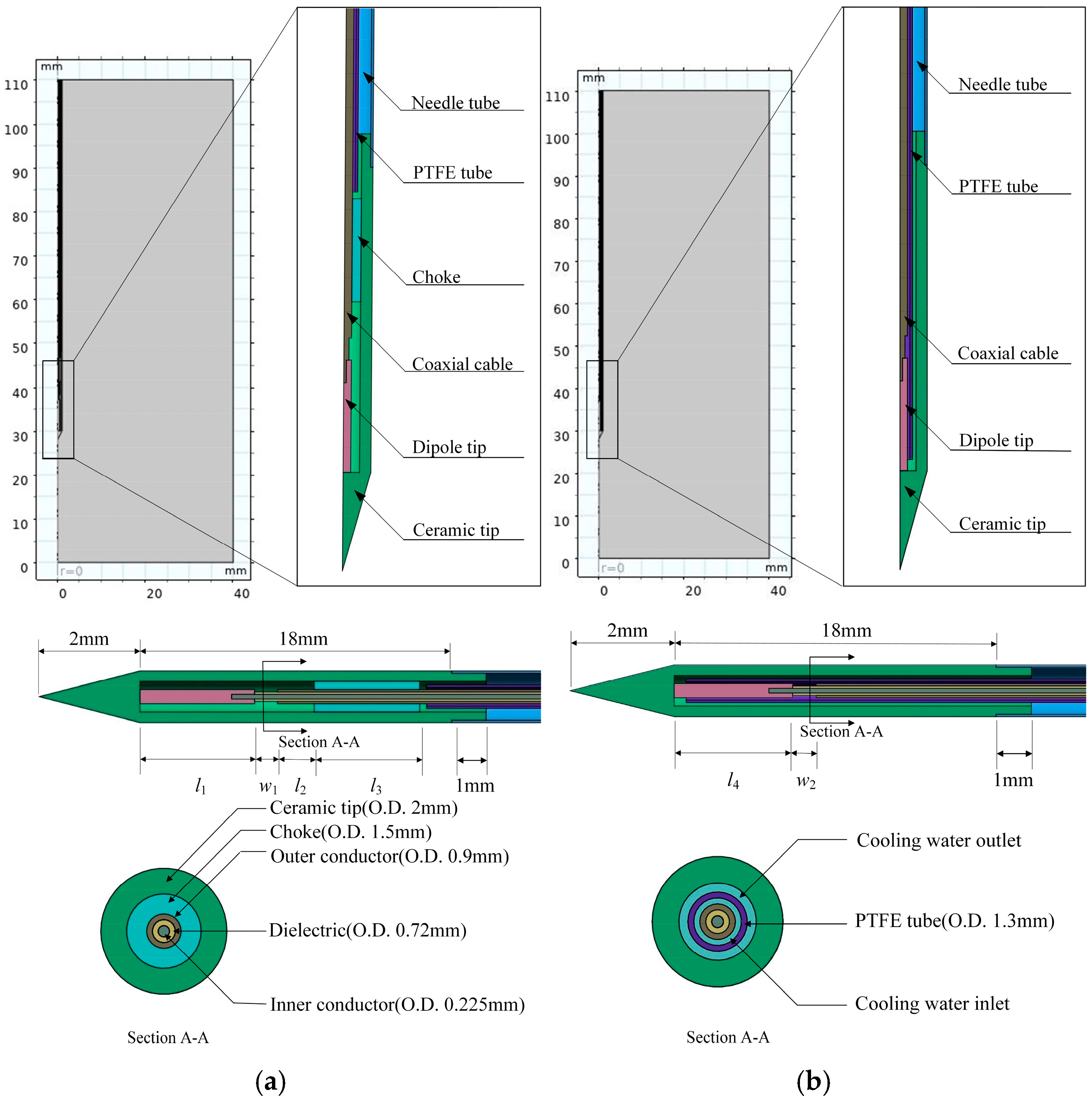 - Wen, Z.; Lin, X.-Q.; Li, C.-N.; Fan, Y.-L. A low-cost invasive microwave ablation antenna with a directional heating pattern. Chin. Phys. B 2022, 31, 038401. [Google Scholar] [CrossRef]