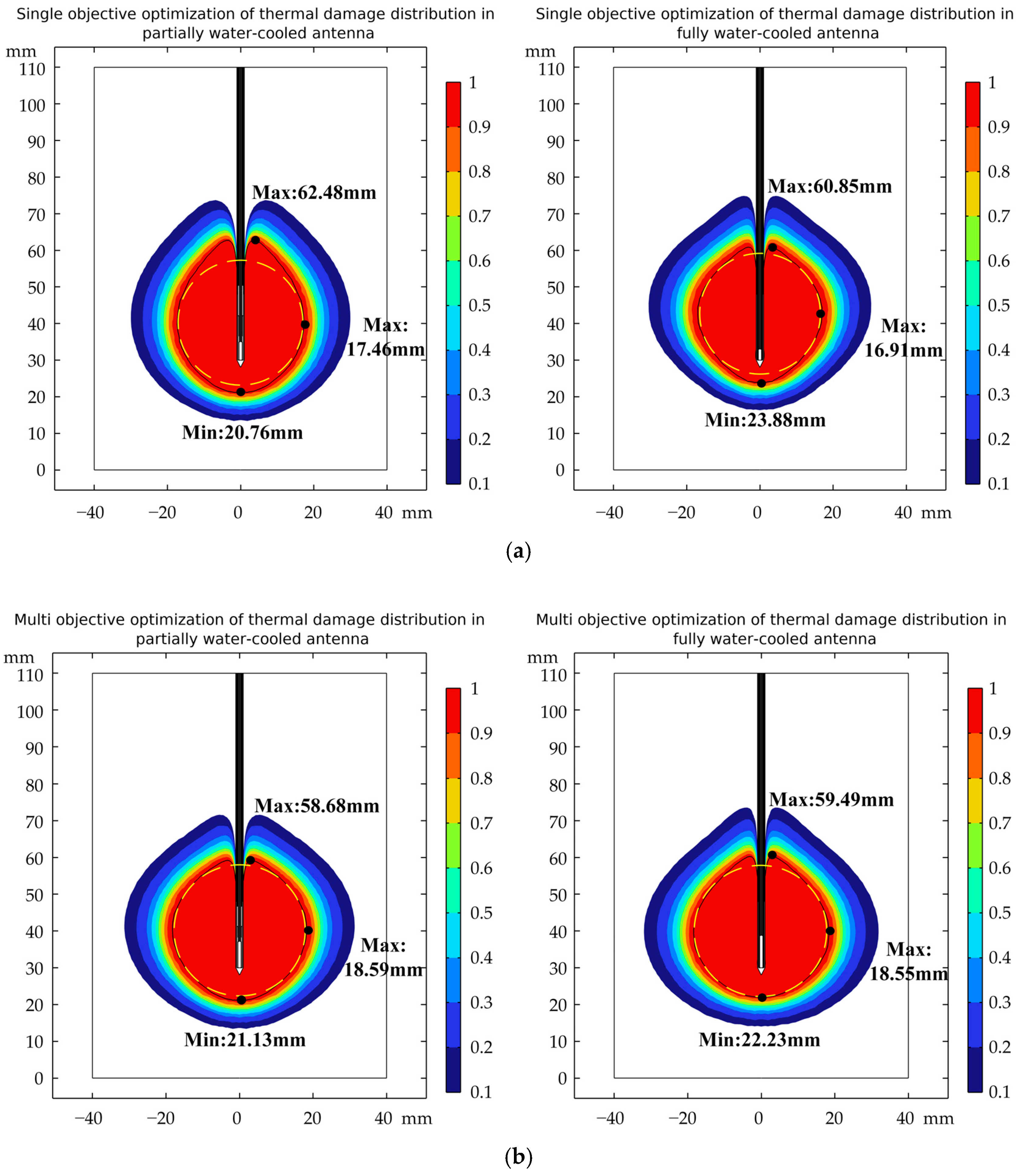 | Partially water-cooled antenna | Single objective | −27.798 | 25.753 | 9.54 |