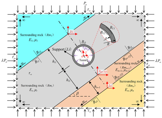 For the convenience of theoretical derivation, the independent boundaries are first assigned numerical labels. Let the independent boundary Bij represent the j-th independent boundary of the i-th inclined stratum Rmi. if i = l, it denotes the concrete lining region. In general, for the first and n-th strata, j = 1. For strata that do not contain the tunnel or concrete lining, j = 2, and for strata traversed by the tunnel, j = 3. Taking the fully penetrated inclined stratum Rmt as an example, its inclined upper boundary, inclined lower boundary, and the boundary separating it from the concrete lining are numbered sequentially as Bt1, Bt2 and Bt3. In addition, interfaces between strata are assigned different labels within their respective strata. For instance, the boundaries B[n−1]2 and Bn1 correspond to the interfaces of the n − 1 and n strata, respectively.