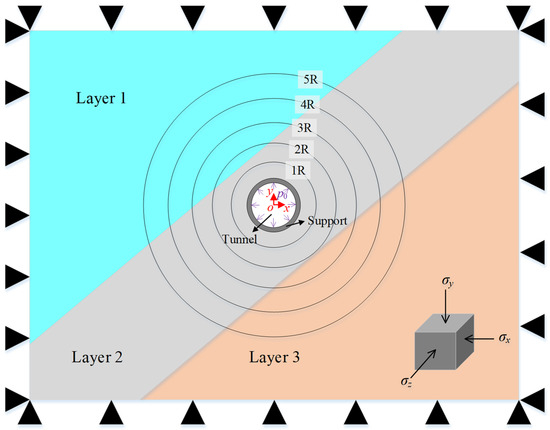 - The deeply buried composite surrounding rock is composed of several inclined strata interlayered with each other. The interfaces between the strata are parallel and non-intersecting. Each stratum is regarded as a homogeneous, isotropic, linear elastic body, which enables explicit analytical derivations while still reflecting the key interlayer stiffness mismatch that governs stress redistribution. The strata are assumed to remain perfectly bonded, without sliding or separation. This assumption is appropriate for deeply buried rock masses where strong interlayer confinement prevents noticeable slip or separation. In geological settings with weakly bonded or soft interlayers (e.g., weak fault zones), interlayer slip may occur and more realistic interaction models would be required. In this study, the analysis focuses on conditions where the interlayers are strongly constrained and can be reasonably treated as perfectly bonded.