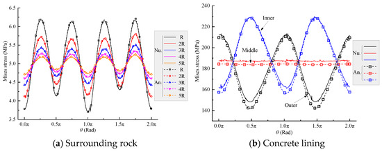 By examining the overall linear systems for the two contact modes between the surrounding rock and the concrete lining, it is evident that both have the same number of linear equations, namely 2(2n + 1)N. The number of unknowns, corresponding to the real and imaginary parts of the undetermined complex coefficients, is . Generally, the number of independent boundaries for the first and n-th strata is 1, while the t-th stratum has 3 independent boundaries. Therefore, the number of unknowns further reduces to 4s(2n + 1) + 2n + 6. According to the calculation point selection scheme, the number of calculation points N on each reference boundary satisfies N ≥ 2s + 1, so the total number of linear equations is no less than 4s(2n + 1) + 4n + 2. For a composite surrounding rock system (n ≥ 2), the total number of linear equations is thus greater than or equal to the number of unknowns. Solving Equations (45) or (46) yields all the undetermined complex coefficients for the two contact modes. Substituting these results into Equations (13) and (14) provides the Cartesian components of stress and displacement for the composite surrounding rock. Substituting into Equations (15) and (16) fully determines the Cartesian stress and displacement components of the concrete lining. This analytical procedure is implemented in a self-developed MATLAB R2022b program, enabling automatic computation from input parameters to mechanical response results.