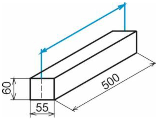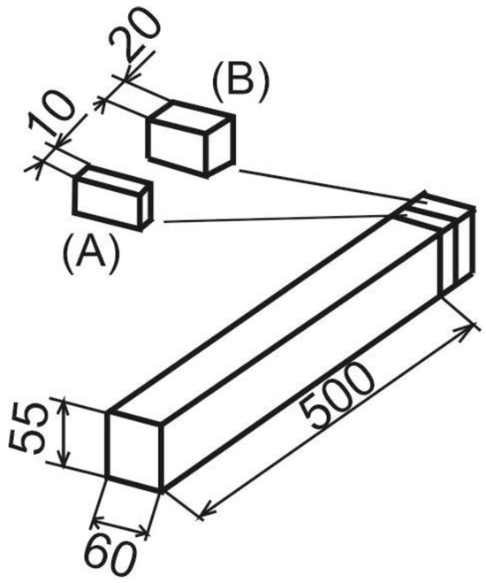 The material selected for research was European beech (Fagus sylvatica L.). This is the most common tree species in Slovak forests and is used for the production of solid glued boards. The material for the investigation was obtained from the Forests of the Slovak Republic area (Poľana, Považie, Tribeč). The samples were 55 mm thick, 60 mm wide, and 500 mm long. The dimensions correspond to the most commonly used dimensions of planks for the production of glued boards. The samples were produced from beech raw wood of quality class III.B (according to STN 48 00 56). The sawmill logs were sawn using a vertical bandsaw-type EWD 1800 with a milling head EWD PF 19 (Esterer WD GmbH, Altötting, Germany) to produce 60 mm thick boards. These were then sawn into long blanks 2000 mm) with a thickness of 55 mm, with a total quantity of 26 pieces. Samples 500 mm long were taken from the long pieces so that they did not contain any visible defects such as cracks, red false heartwood, rot, or knots. Samples were taken from each sample to also determine the absolute moisture content and density of the wood (Figure 1).