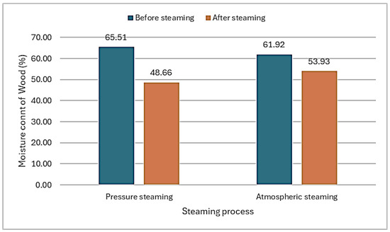 Similar results are reported in the work of [17,22], who report a 22% decrease in moisture content when pressure steaming beech wood (Fagus sylvatica L.). Our observations are consistent with the authors [15] which reported that, when Eucalyptus dunia wood was steamed before drying (t = 100 °C, φ = 100%, τ = 3 h), the initial moisture content of the steamed lumber decreased by 9.2% compared with that of unsteamed timbers.