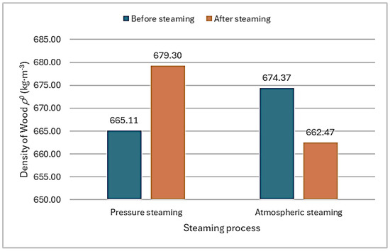As also shown by [7], the decrease in mass and change in density of steamed beech wood also depend on the conditions and duration of steaming process. During atmospheric steaming at temperatures up to 100 °C, a lower mass loss is achieved. As also shown in research [12], for example, a density reduction of up to 2% for Fagus orientalis L. was reported after steaming at 80 °C for 100 h. A greater loss of mass, accompanied by more significant chemical changes, occurs during pressure steaming at temperatures above 120 °C. For beech wood, this loss can reach 5–7% [11]. After pressure steaming, the average increase in sample density was 14.19 kg·m−3. After atmospheric steaming, the density of the samples decreased by 11.9 kg·m−3. In a statistical comparison of the significance of the differences in mean values between the steaming methods, statistically insignificant differences were measured between the change in density before and after steaming (Figure 6). The method and conditions of steaming thus had no effect on the change in density of the samples.