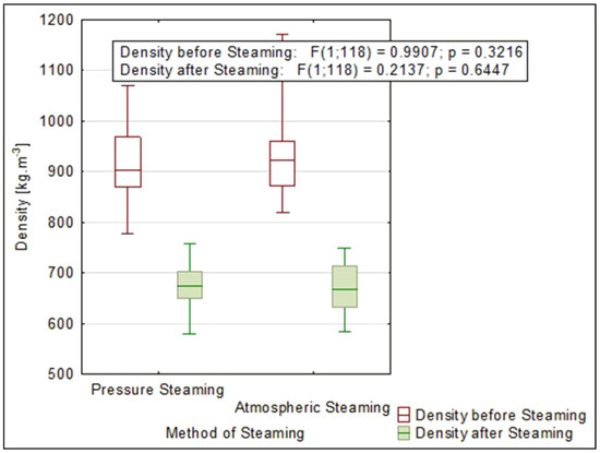 The density of wood affects its basic properties (strength, modulus of elasticity, specific heat capacity, thermal conductivity, etc.) and some properties determining the mechanism of internal water movement, such as the coefficient of moisture conductivity. Changing the density will change the dimensions and distribution of the spaces filled with water. It is important to identify the influence of steaming parameters on the change in density and thus the possible change in other wood properties [12,23].