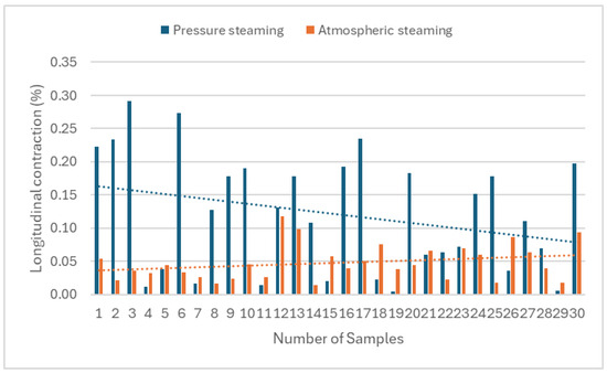 The longitudinal contraction values of the samples were calculated according to Equation 3, with the length of the samples after steaming being measured 24 h after removal from the steaming device. Measurements were taken on 30 samples for each steaming method (Figure 7). The basic statistical characteristics for the individual steaming methods are shown in Table 4, and a graphical representation of the unmeasured sample values and trend lines is shown in Figure 7.
