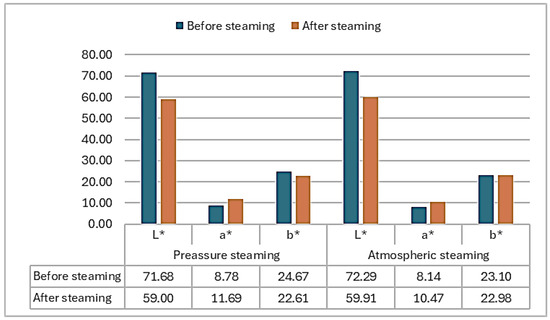 Average values of coordinates L*, a*, and b* before and after pressure and atmospheric steaming.