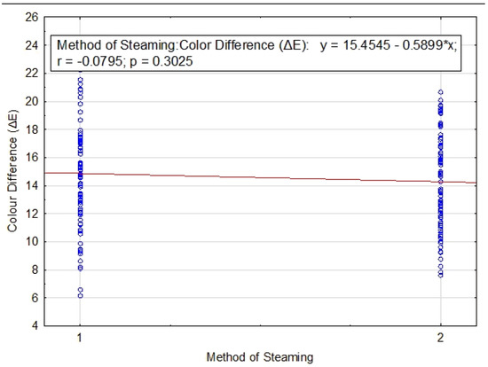 - There were no statistically significant effects of steaming conditions (temperature, time, and pressure) on the change in colour space coordinates or on the size of the colour difference ΔE. Approximately the same colour change was achieved with both steaming methods.