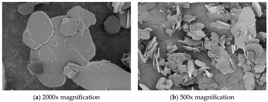 The raw materials were characterized prior to filament production. SEM images of PLA granules (Figure 4a,b) revealed relatively smooth polymeric surfaces with fibrillar microstructures, while Energy Dispersive X-ray Spectroscopy (EDS) confirmed that PLA consists primarily of carbon (53.95 wt.%) and oxygen (46.05 wt.%) (Figure 4c). In contrast, hBN particles (Figure 5a,b) exhibited a typical lamellar, plate-like morphology, consistent with their hexagonal crystalline nature. The elemental composition of hBN was further validated by EDS (Figure 5c), which showed boron (~40.88 wt.%) and nitrogen (~59.12 wt.%) contents in near-stoichiometric proportions.