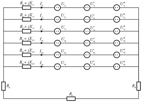 Here, Rd denotes the grounding resistance of the cable, while Re signifies the equivalent leakage resistance of the surrounding soil. Rsi, Xsi, Rai, and Xai represent the resistance and self-inductive reactance of the materials comprising the metal sheath and armor layers. Isi and Iai indicate the circulating currents generated in the i-th phase of the metal sheath and armor layers, respectively, where i ranges from 1 to 3. The induced voltage Usi, U′si and U″si refer to the voltage generated in the i-th phase of the metal sheath material by the current flowing through the cable core conductor, as well as by the circulating currents in the metal sheath and armor layers. Additionally, it encompasses the induced voltage in the i-th phase of the armor layer material, which is produced by the circulating currents associated with the cable core conductor, the metal sheath layer, and the armor layer.