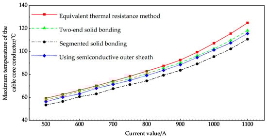 Set the core current values of the cable to 500 A, 550 A, 600 A, 650 A, 700 A, 750 A, 800 A, 850 A, 900 A, 950 A, 1000 A, 1050 A and 1100 A, respectively. The cable core temperatures were calculated and compared with simulation results under three grounding modes: two-end solid bonding, segmented solid bonding (with two intermediate short-circuit points), and semiconductive outer sheath. The results are shown in Table 1 and Figure 6 and Figure 7.