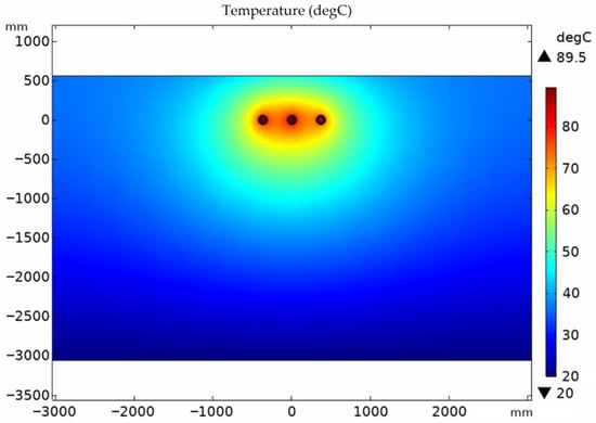 Finite Element Method (FEM) is a widely used and effective numerical technique for solving coupled electromagnetic and thermal problems. To validate the model in the two-end solid bonding configuration, a simulation was conducted using COMSOL Multiphysics 6.3 software. A 2D model was established with a burial depth of 500 mm and a cable outer surface spacing of 250 mm. The surrounding soil was set at 20 °C, with a thermal conductivity of 1 W/m·K, which is a typical value of thermal conductivity of moist soil [29,30]. According to the equivalent thermal resistance method, the calculated current-carrying capacity is 875.8 A, and the value obtained from the equivalent model is 897.6 A. FEM simulation results show that when the current-carrying capacity is set to 897.6 A, the cable core conductor temperature reaches 89.5 °C. The output results of the simulation are shown in Figure 8.