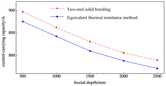 The burial depths were set at 500 mm, 1000 mm, 1500 mm, 2000 mm, and 2500 mm. The ampacity was calculated under the two-end solid bonding mode and using the equivalent thermal resistance method. The variation in ampacity with laying depth and the comparison of results between the two methods are presented in Table 3 and Figure 10.