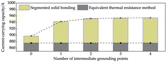 Compared with the equivalent thermal resistance method defined in IEC 60287, the proposed method explicitly accounts for the redistribution of induced currents caused by segmented solid bonding. Since the IEC method does not include this effect, its calculated ampacity remains unchanged regardless of the number of intermediate grounding points. In contrast, the proposed model shows that introducing segmented solid bonding progressively reduces sheath circulating current and therefore decreases sheath losses. As shown in Table 4, the metal sheath loss decreases from 13.93 W·m−1 (under two-end solid bonding) to 4.06 W·m−1 (with four intermediate grounding points). This reduction directly contributes to the improvement in current-carrying capacity.