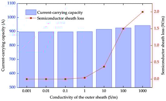 Overall, the results demonstrate that the improved method for calculating current-carrying capacity is highly effective. The semiconductive outer sheath enhances the cable’s current-carrying capacity, particularly at higher conductivity values, while the increase in semiconductor sheath loss remains relatively small.