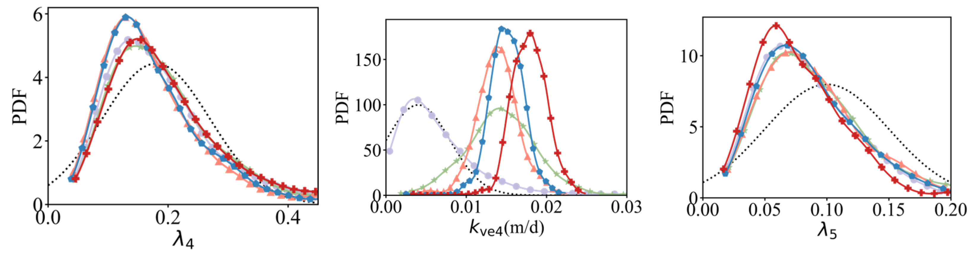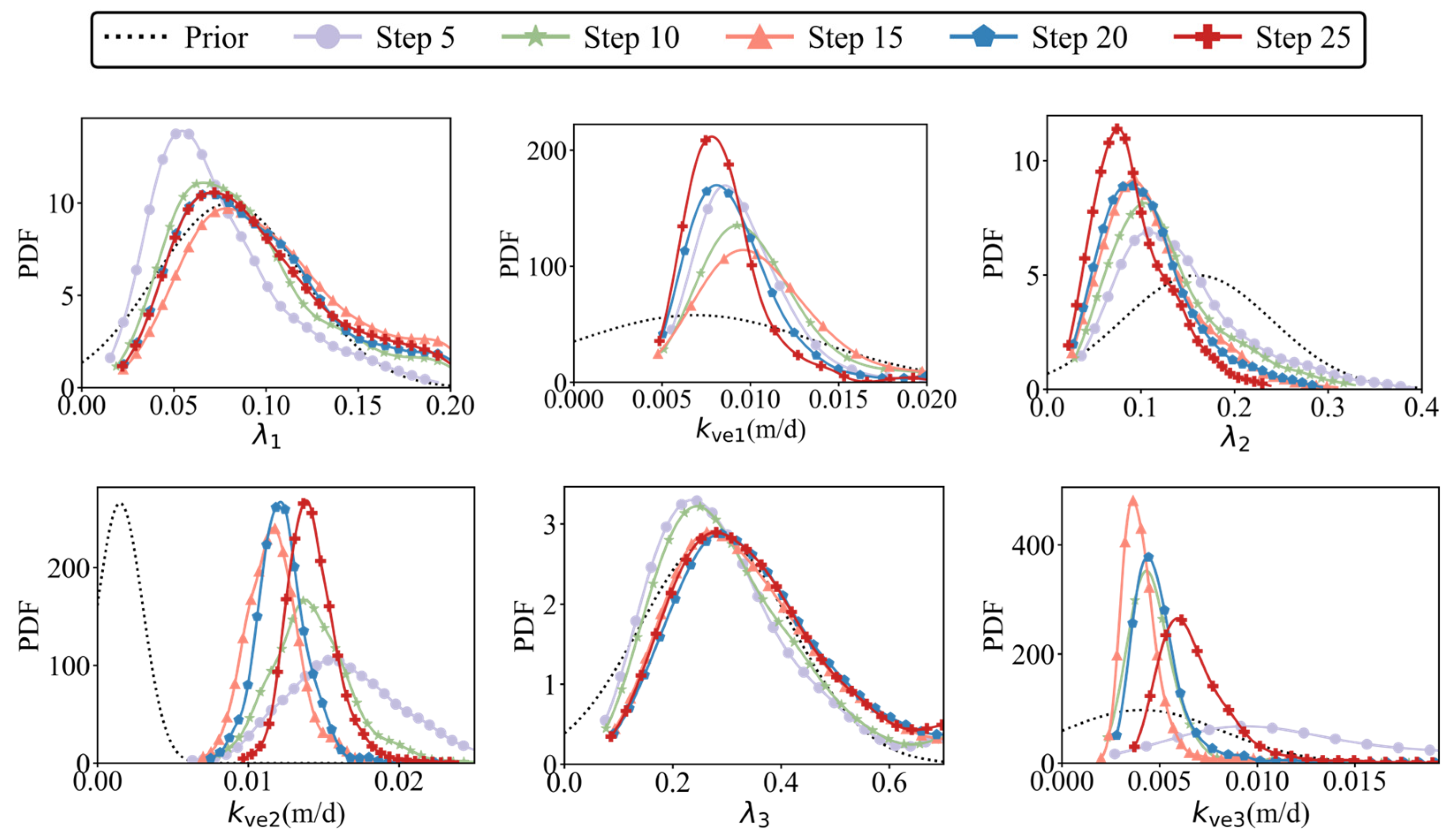 - In terms of parameter updating, ES-MDA can adaptively refine key consolidation parameters, including the compression index λ and the equivalent vertical permeability kve of each soil layer, by progressively assimilating field monitoring data. Compared with the prior parameters derived from limited oedometer tests and empirical estimates, the posterior probability density functions become more concentrated, and their means exhibit significant shifts, indicating biases in the initial parameter values. The prior mean compression index λ obtained from laboratory tests tends to be overestimated, whereas the prior mean vertical permeability tends to be underestimated. After ES-MDA updating, both compressibility and drainage capacity are adjusted in a manner more consistent with the observed settlement response, and the uncertainty in the parameters is significantly reduced, providing a more reliable basis for subsequent settlement prediction.