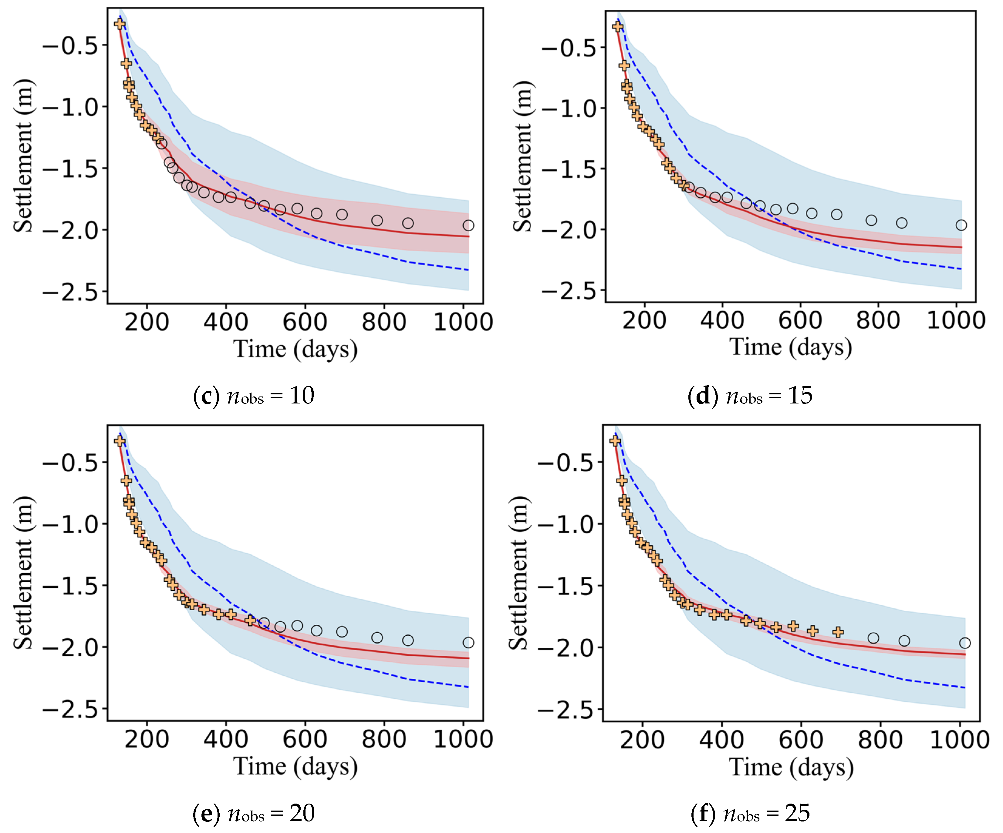 - Tian, H.; Cao, Z.; Li, D.; Du, W.; Zhang, F. Efficient and flexible Bayesian updating of embankment settlement on soft soils based on different monitoring datasets. Acta Geotech. 2021, 17, 1273–1294. [Google Scholar] [CrossRef]