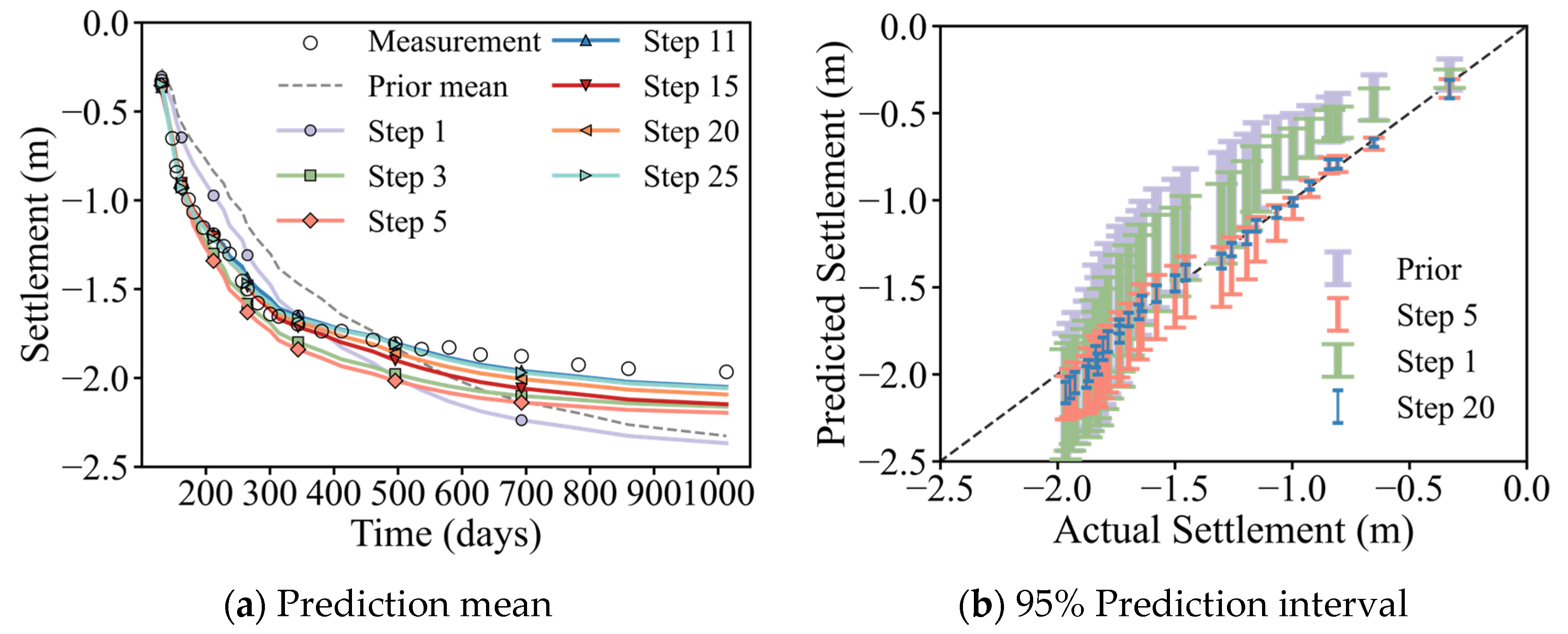 - Regarding settlement prediction and uncertainty characterization, ES-MDA effectively exploits early-stage monitoring data to substantially improve long-term settlement prediction performance. Predictions based on prior parameters exhibit a wide 95% prediction interval and a pronounced bias between the predicted mean settlements and the measured values. After assimilating a limited number of observations, the agreement between the predicted mean and the monitoring history improves markedly, and the prediction interval narrows significantly, leading to reduced bias and uncertainty. As more observations are assimilated, prediction errors may exhibit slight and localized increases at certain stages; however, the overall prediction accuracy and stability are considerably superior to those based on the prior parameters. This indicates that, while preserving physical interpretability, the proposed method can provide robust long-term settlement predictions for embankments on soft soil.