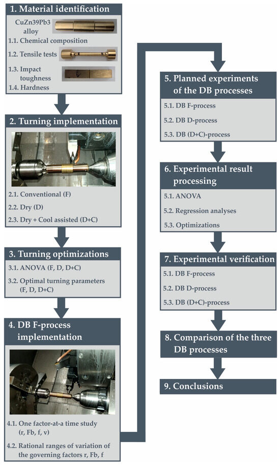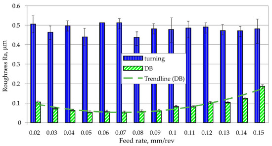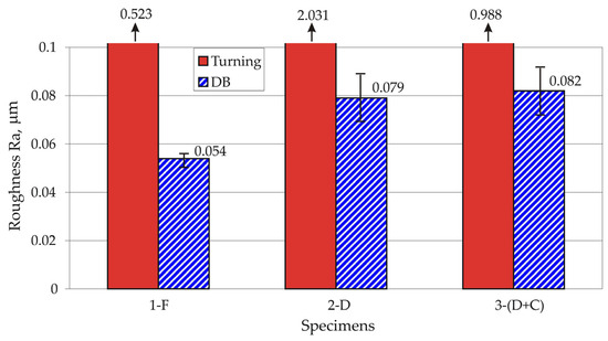 - Planned experiments and analyses of variance (ANOVA) were used to identify the optimal feed rate, cutting velocity, and cutting depth of each turning process (F, D, and D+C) by minimising the roughness parameter (Ra). All subsequent turning operations (performed before each DB process) were carried out using these optimal values.