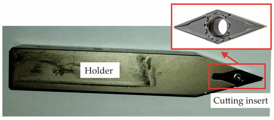 Turning was performed on an Index Traub CNC lathe (Esslingen am Neckar, Germany) under three cutting conditions: (1) flood lubrication (F) using Vasco 6000 lubricant; (2) dry conditions (D); and (3) dry + cool-assisted conditions (D+C) using a custom vortex-tube cold-air nozzle (Emuge-Franken, Germany). The experimental setup involved VCMT 160404–F3P carbide cutting inserts with a main back angle and radius at the tool tip of 0.4 mm, as well as an SVVCN 2525M-16 holder with main and auxiliary mounting angles of and , respectively (Figure 2). Each turning process used a freshly run insert (run for several minutes) to ensure uniform wear conditions.