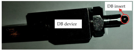 Turning and DB were carried out in a single clamping process. The burnishing tool ensures elastic normal contact between the deforming diamond insert and the treated surface (Figure 3). DB was implemented using spherical-ended polycrystalline diamond inserts under three types of burnishing conditions: (1) flood lubrication (F); (2) dry conditions (D); and (3) dry + cool-assisted conditions (D+C).
