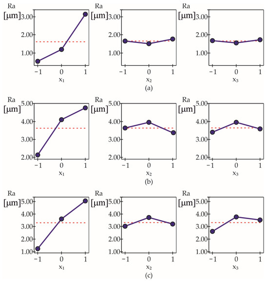 The governing factors of the turning processes, including feed rate f, cutting velocity , and cutting depth , their values, and the experimental results are presented in Table 2. The objective function used in the study was the Ra roughness parameter. An optimal second-order compositional design, also known as a Bm-type design and developed by Andrukovich et al. [66], was used. A central point is not recommended for more than two factors. The optimal compositional design was developed based on the Box and Wilson design [67], in which only a few more trials are added to the full factorial experiment. ANOVA was performed using the QStatLab software, v.6.1.1.3 [68]. Table 3 presents ANOVA results computed by QStatLab for the turning processes, and Figure 4 illustrates the degree of influence that each factor had on Ra. Feed rate was found to be the most significant factor, while the cutting velocity and depth had a significantly smaller influence on Ra. This trend was most pronounced in turning processes conducted under F conditions.