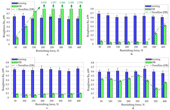 A 2 mm radius was found to be unsuitable for this alloy except for the combination of r = 2 mm and burnishing force of 50 N, which resulted in an average Ra of 0.156 μm (Figure 5a). Burnishing forces above 100 N significantly worsened the initial post-turning roughness. Larger radii (3, 4, and 5 mm) reduced the initial roughness of all burnishing force values tested. The 3 mm radius produced Ra values from 0.044 to 0.073 μm for forces up to 300 N, but increasing the force to 400 N caused Ra to rise sharply to 0.436 μm (Figure 5b). The 4 mm radius exhibited the most stable performance, maintaining an average Ra below 0.1 μm across all burnishing forces (Figure 5c). The largest radius, 5 mm, also reduced initial roughness but yielded a wide range of Ra values (0.209–0.508 μm) depending on the magnitude of the burnishing force; no clear trends were identified (Figure 5d). Based on these results, diamond insert radii of 3 and 4 mm and a burnishing force range of 100–400 N were selected for the planned experiments.