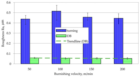 The diamond radius, burnishing force, and feed rate were held constant at 3 mm, 250 N, and 0.07 mm/rev, respectively. When the burnishing velocity was varied between 50 and 200 m/min, the Ra values remained relatively constant, with only a slight downward trend (Figure 7). High burnishing velocities are known to result in the thermal softening of the surface layer [71,72]; however, finite element simulations [72] have shown that this effect can be ignored at velocities below 100 m/min. Accordingly, all subsequent DB processes were conducted at a burnishing velocity of 80 m/min.