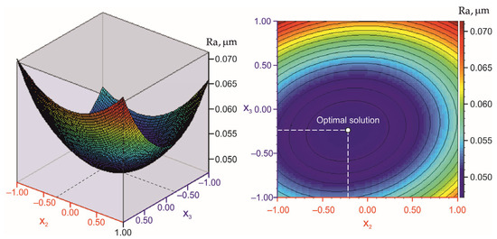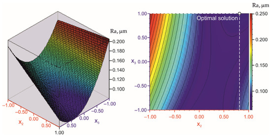 The three DB processes were optimised by identifying the minima of the corresponding models without applying any parametric or functional constraints. The analyses were performed using QStatLab and a non-dominated sorting genetic algorithm II [74]. The optimal sizes of the governing factors and the minimum Ra values are presented in Table 9 and are consistent with the ANOVA results. Figure 9, Figure 10 and Figure 11 illustrate the optimal solutions for the three DB processes; in all cases, the radius r of the diamond insert is 4 mm or .