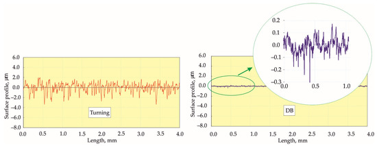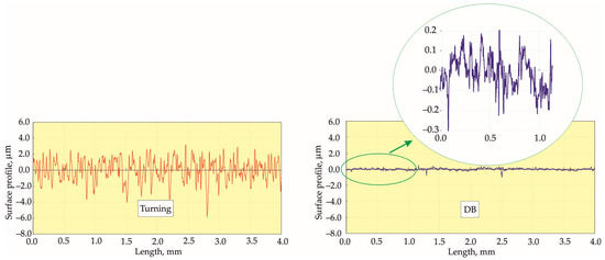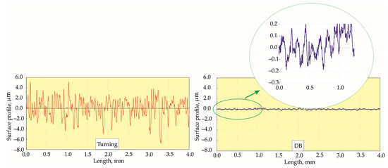 Twenty samples were processed for each DB process using their corresponding optimal governing factors in order to assess the stability of the obtained Ra values. All turning processes were performed under identical conditions. One sample from each group was selected; the selected sample possessed an Ra value that was closest to the arithmetic mean of its respective group. Figure 12, Figure 13 and Figure 14 compare the roughness profiles after the turning process (left) and after the DB process for each of the three selected samples.