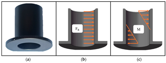 During actual service, the load borne by the bushing mainly originates from the aerodynamic forces acting on the stator blades. Specifically, the aerodynamic load is converted at the root of the blade into radial force and bending moment , which are then transmitted through the blade’s journal to the bushing. Figure 1 shows the structure of the bushing and the effects of radial force and bending moments on the bushing. The radial force causes a displacement of the center position of the bushing, while the bending moment results in the inclination of the bushing. The interaction of these two loads leads to complex deformations of the bushing during blade operation, which in turn affects the contact state between the bushing and the journal, ultimately influencing the wear behavior of the bushing.